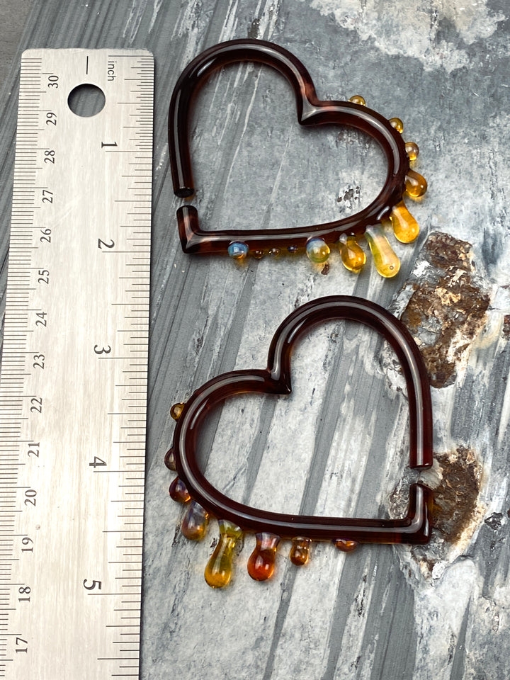 Honey Drip | Large Glass Hearts | 10G - 0G [ Pair shown is a 4G ] These are hand-formed out of borosilicate glass with the highest standards in both the glass industry and the piercing industry. These are the larger hearts with an average diameter of 2.5". If you have a specific length in mind, let me know when you are placing your order. The price could vary depending on diameter.