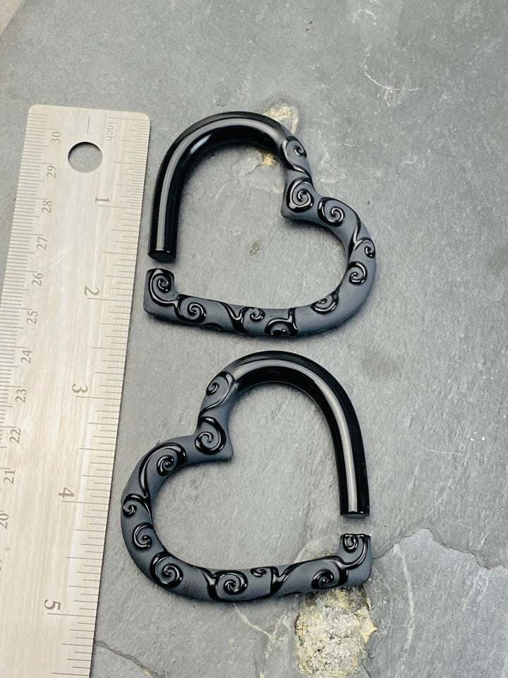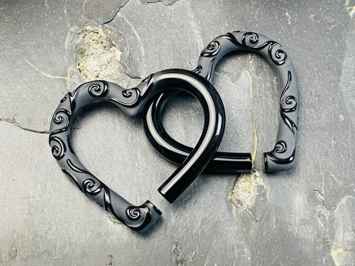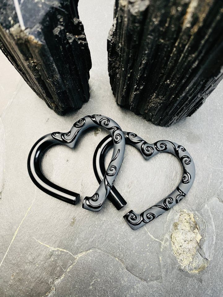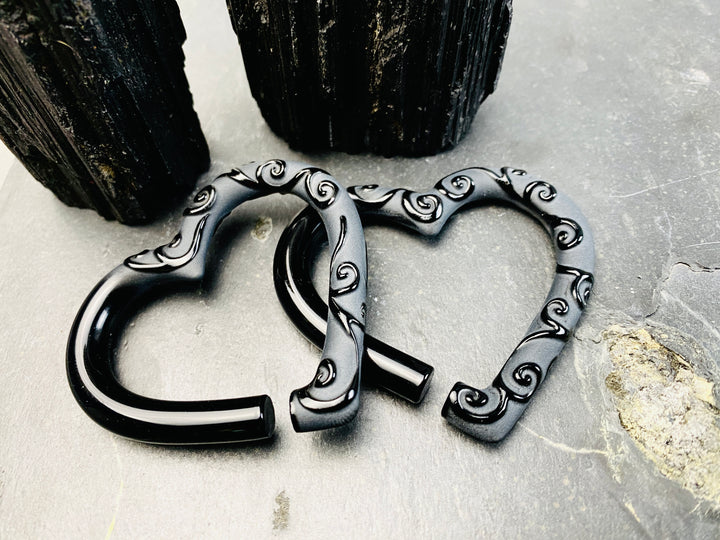 MADE TO ORDER | 2-4 WEEKS* RAVEN Filigree | GLASS HEARTS These pairs feature solid black borosilicate glass hearts designed for stretched ears. This pair is shown in a OG. A...
