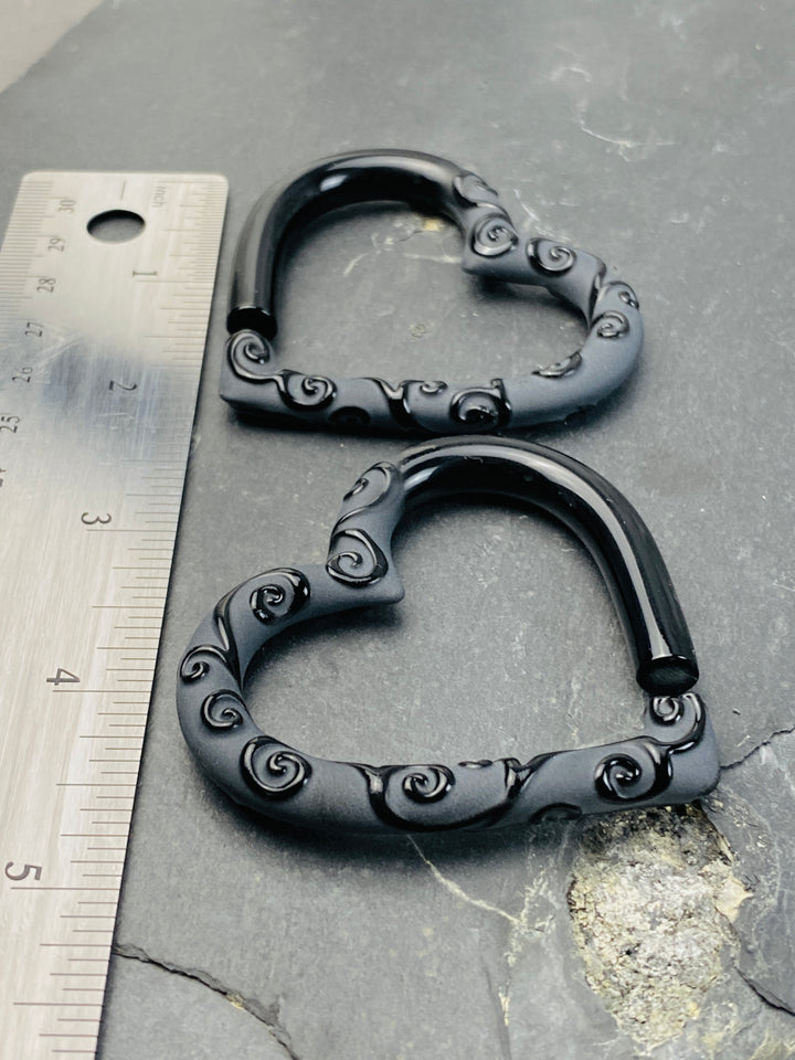 These pairs feature solid black borosilicate glass hearts designed for stretched ears. This pair is shown in a OG. A raised filigree pattern has been sandblasted over the surface and flame polished to show high contrast in the detail. This carving pattern can be applied to our other colors and shapes. These hang beautifully through silicone ear-skins and larger stretched lobes.